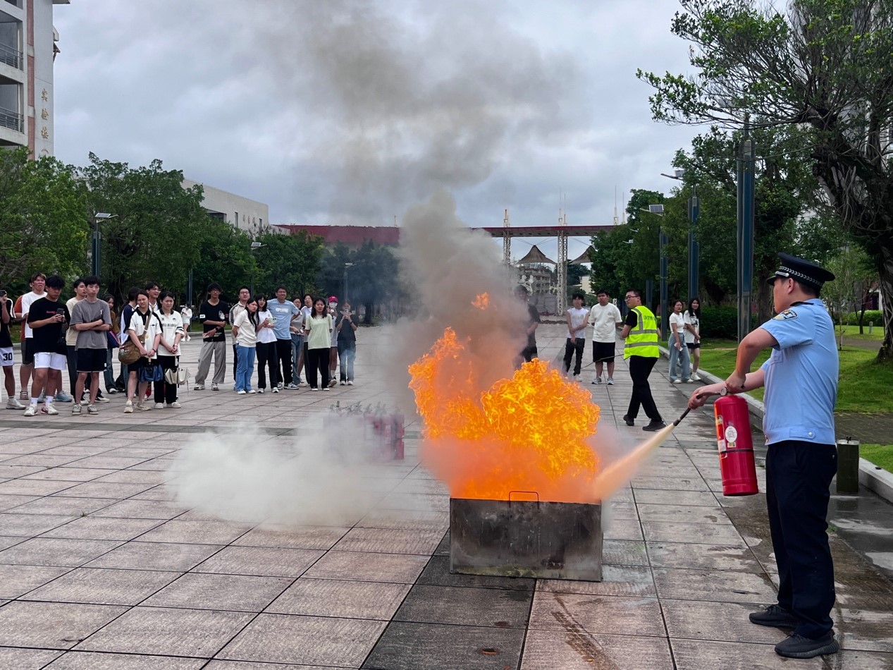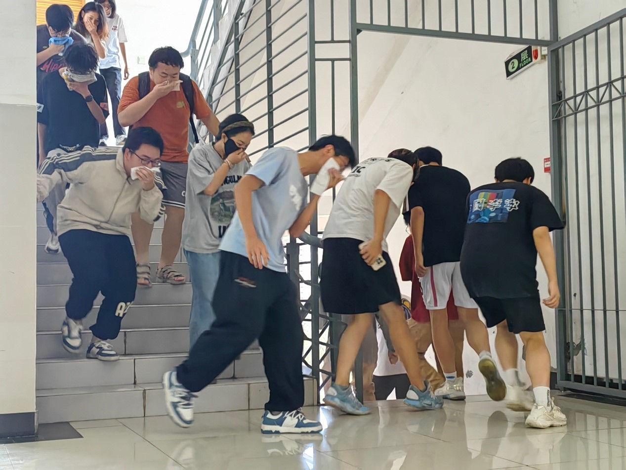 在消防演练环节,模拟了实验室突发火灾的场景。火势迅速蔓延,浓烟滚滚,师生们按照预定的方案,由实验室教师引导迅速按照疏散路线有序撤离。在撤离过程中,师生们严格遵守消防安全规范,保持冷静,用湿毛巾捂住口鼻,弯腰低姿,确保自身安全。通过此次演练,师生们进一步掌握了火场逃生的基本方法和技巧,提高了应对突发火灾事故的能力。现场还联系驻校民警为师生们进行现场指导和培训,详细介绍了实验室常用灭火器的使用方法和注意事项,并现场演示了灭火器的操作流程。师生们积极参与互动环节,纷纷上前体验灭火器的使用,进一步提高了应急自救能力。