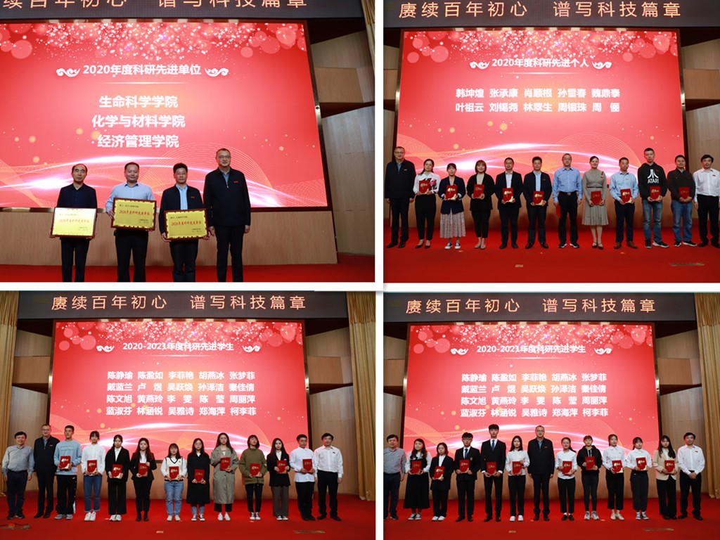 10月25日下午,学校在图书馆报告厅举行第十二届科技活动月暨社科普及周启动仪式。会上,我院受颁2020年度科研先进单位;我院教师叶祖云教授获得2020年度科研服务地方先进个人,韩坤煌、张承康获得2020年度科研先进个人,周银珠获得2020年度科研管理先进个人;我院学生李菲艳、胡燕冰获得2020年度科研先进学生。