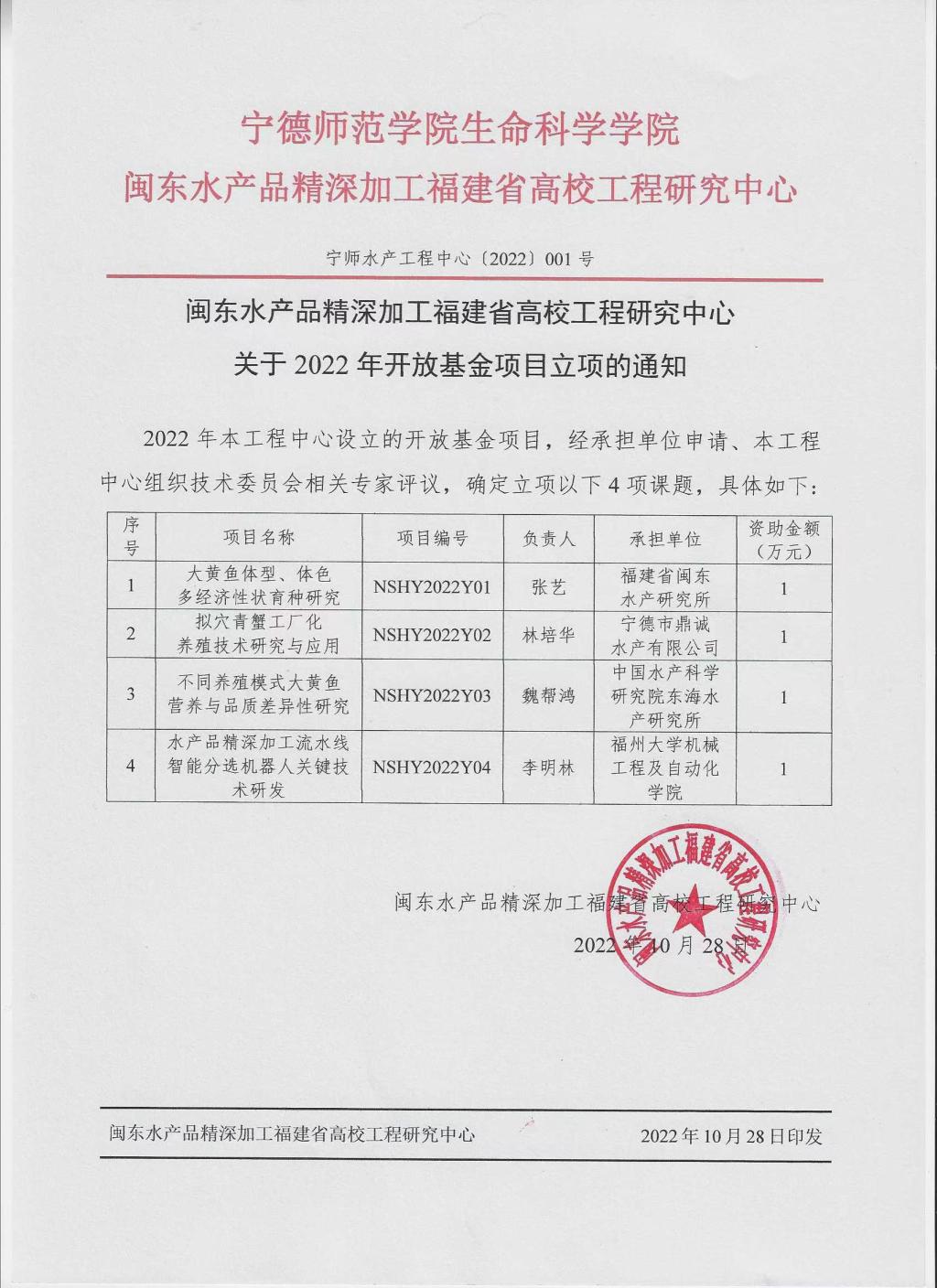 闽东水产品精深加工福建省高校工程研究中心关于2022年开放基金项目立项的通知