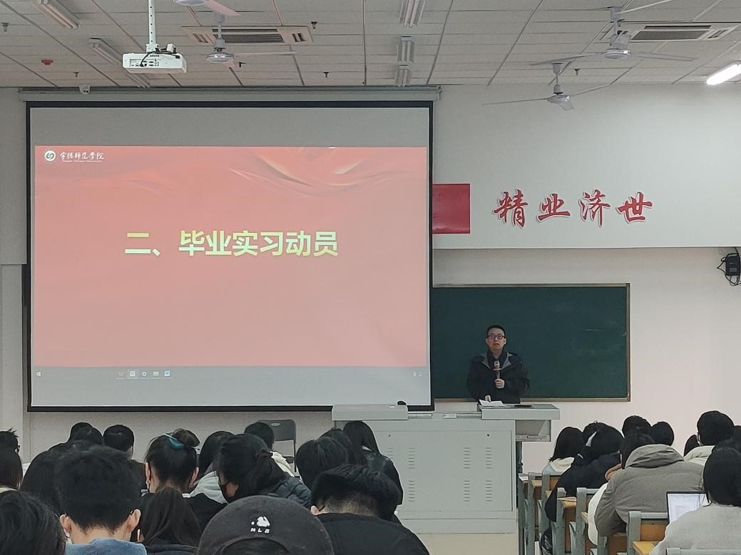 随后,孙壮桥副院长进行毕业实习动员,特别强调了实习期间的安全教育,详细讲解了实习期间的安全注意事项,包括人身安全、信息安全等,普及了相关法律法规知识,增强毕业生的自我保护意识。同时,孙壮桥副院长表示当前就业形势十分严峻,鼓励毕业生树立先就业后择业的意识,引导毕业生积极对待就业,做好就业准备。