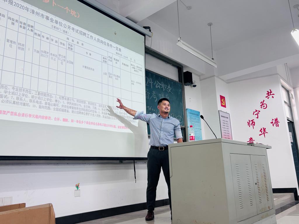 首先,学昊教育游思泽老师从对公职考试的全面剖析、大三和大四的学生如何准备公职考试以及注意事项、如何根据本专业选择合适岗位三个方面入手,带领同学们初步认识“考公”。接着,学昊教育雷炜锋老师介绍学昊福建各地市招聘岗位。同时,学昊教育雷炜锋老师向同学们讲解学昊教育的发展历程与未来展望,提醒同学们要提前做好就业准备。在宣讲会临近尾声时,学昊教育雷炜锋老师介绍了薪资福利结构,真诚的邀请我院学生加入学昊教育实现自我理想。