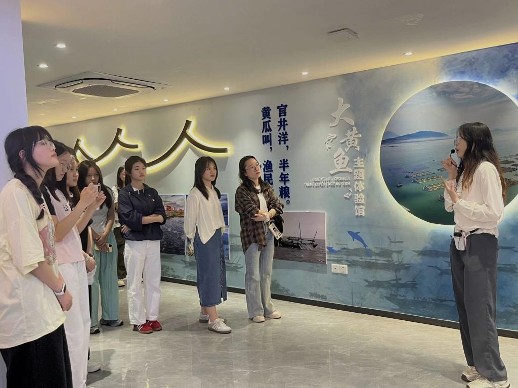 活动伊始,支部党员何丽贞同志化身讲解员,为支部全体成员讲解展示馆前的福船模型,还通过全息投影技术直观感受大黄鱼从人工繁育、深海网箱养殖到冷链物流的全产业链发展历程。在展区的第二部分,讲解员郭湉湉通过生动有趣的国鱼故事,讲解了端午节间在民间关于大黄鱼的相关习俗,加深了党员们对大黄鱼的认识。随后,讲解员张慧萍详细讲述了大黄鱼产业从上世纪60年代敲罟渔法导致资源枯竭,到刘家富团队在突破人工育苗技术的复兴历程,党员们对“绿水青山就是金山银山”这一理念有了更深入的理解。最后,大家来到大黄鱼文创展区,沉浸式欣赏了陈丹丹老师的非物质文化遗产——鱼拓、以黄鱼满仓为理念的吊顶设计、大黄鱼美食模型等,对大黄鱼文化有了更全面的认识。讲解员深入浅出的讲述,让党员们沉浸其中,对大黄鱼产业有了全方位、深层次的认识。通过参观与讲解,党员们深刻体会到“海洋强国”战略的伟大意义,更加坚定了投身海洋经济的信念与决心。