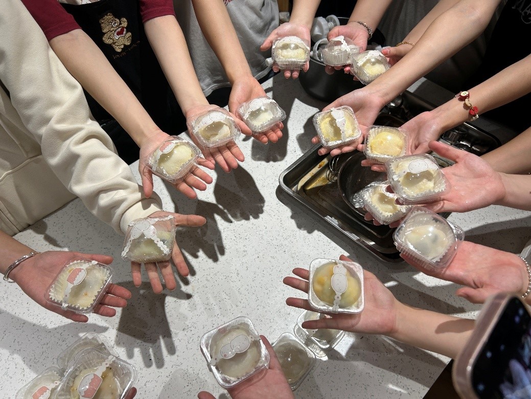 雪媚娘制作环节,是创意与甜蜜的融合时刻。活动开始前,工作人员向同学们详细介绍了雪媚娘的制作技巧,并现场演示了擀皮、包馅、塑形的步骤。同学们利用现场准备的糯米粉、淡奶油、新鲜水果、奥利奥碎等丰富食材,充分发挥想象力,制作出各具特色的雪媚娘。这不仅是一场甜品DIY,更是一次味蕾与创意的碰撞。在工作人员的耐心指导下,活动现场充满了欢声笑语。有的同学动作娴熟,将面皮擀得薄而均匀,包裹的馅料饱满诱人,成品精致如艺术品;初次尝试的同学们则三两合作,分工协作,有的负责打发奶油,有的精心切配水果,在互动中体验团队协作的快乐。最后的作品展示环节,大家纷纷拍照留念,分享制作心得,甜蜜的氛围感染了每一位参与者。这一场景生动展现了甜品文化在校园中的活力与创新。同学们在揉捏擀包中,不仅感受到了手工制作的成就感,更体会到了甜品背后蕴含的细腻与温情。
