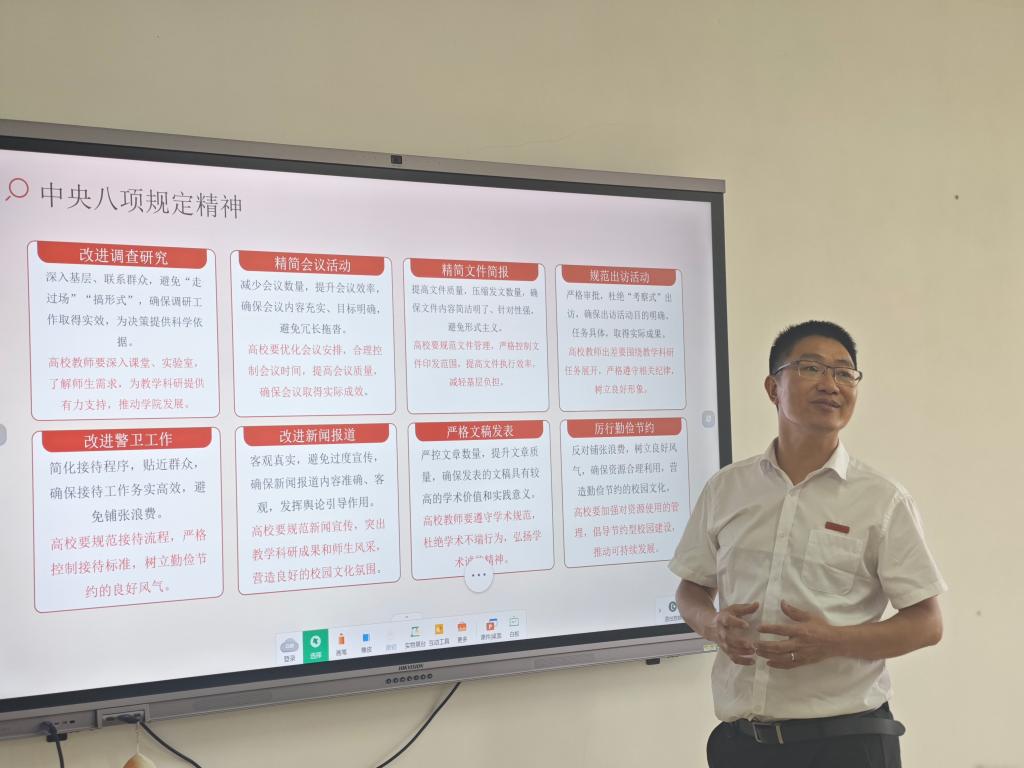 为深入贯彻落实中央八项规定精神,推进学院作风建设,强化党员教师的纪律意识和责任担当,2025年6月17日下午,我院副院长郑世仲为教师党支部全体党员开设“加强中央八项规定精神学习,深入开展警示教育活动”专题党课。